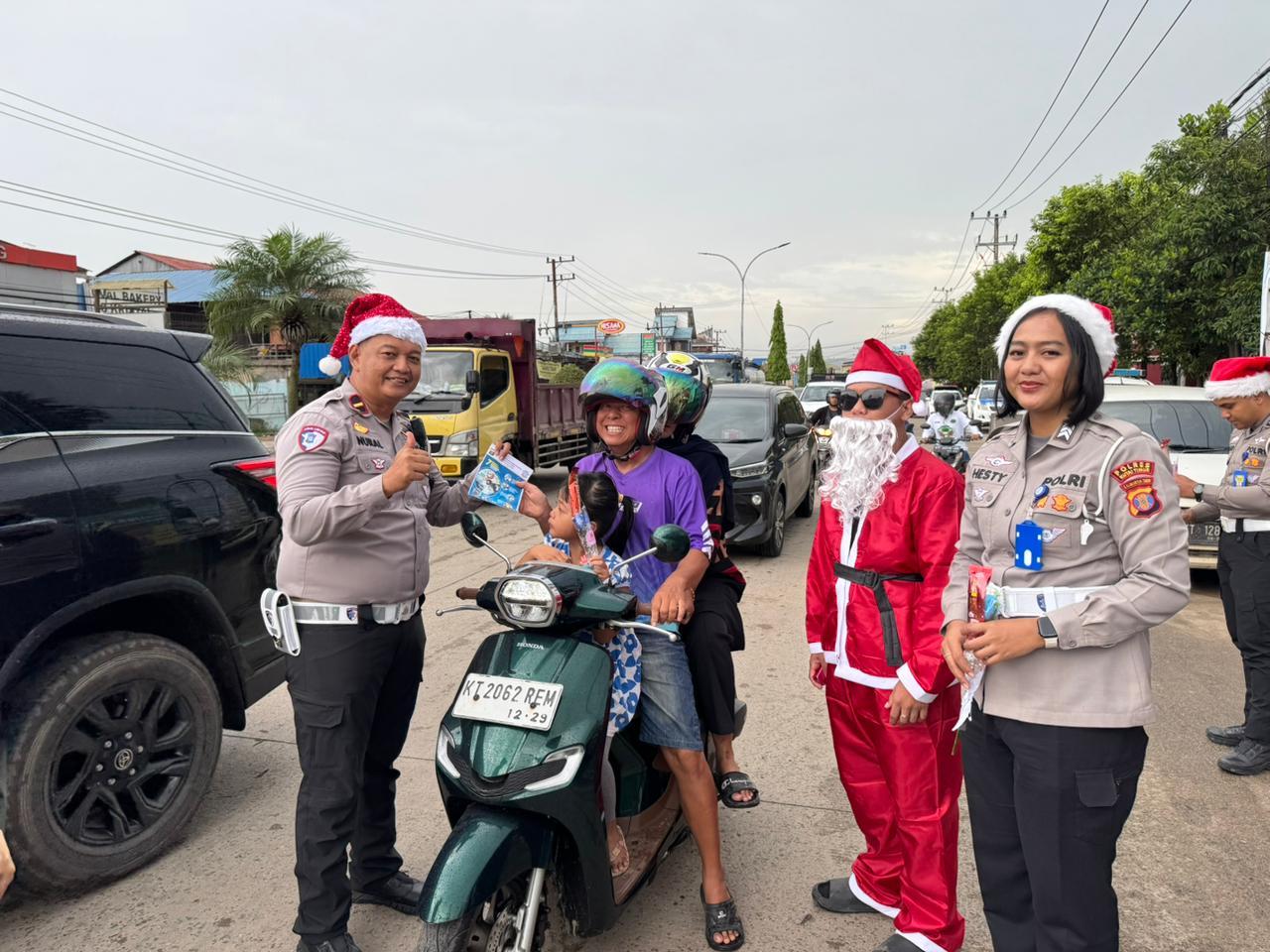 Kegiatan tersebut dilaksanakan di Simpang 3 Pendidikan, Kecamatan Sangatta Utara, Kabupaten Kutai Timur, Rabu (24/12/2025). Kehadiran polisi dengan atribut khas Natal itu sontak menarik perhatian pengguna jalan, baik pengendara roda dua maupun roda empat yang melintas di kawasan tersebut.