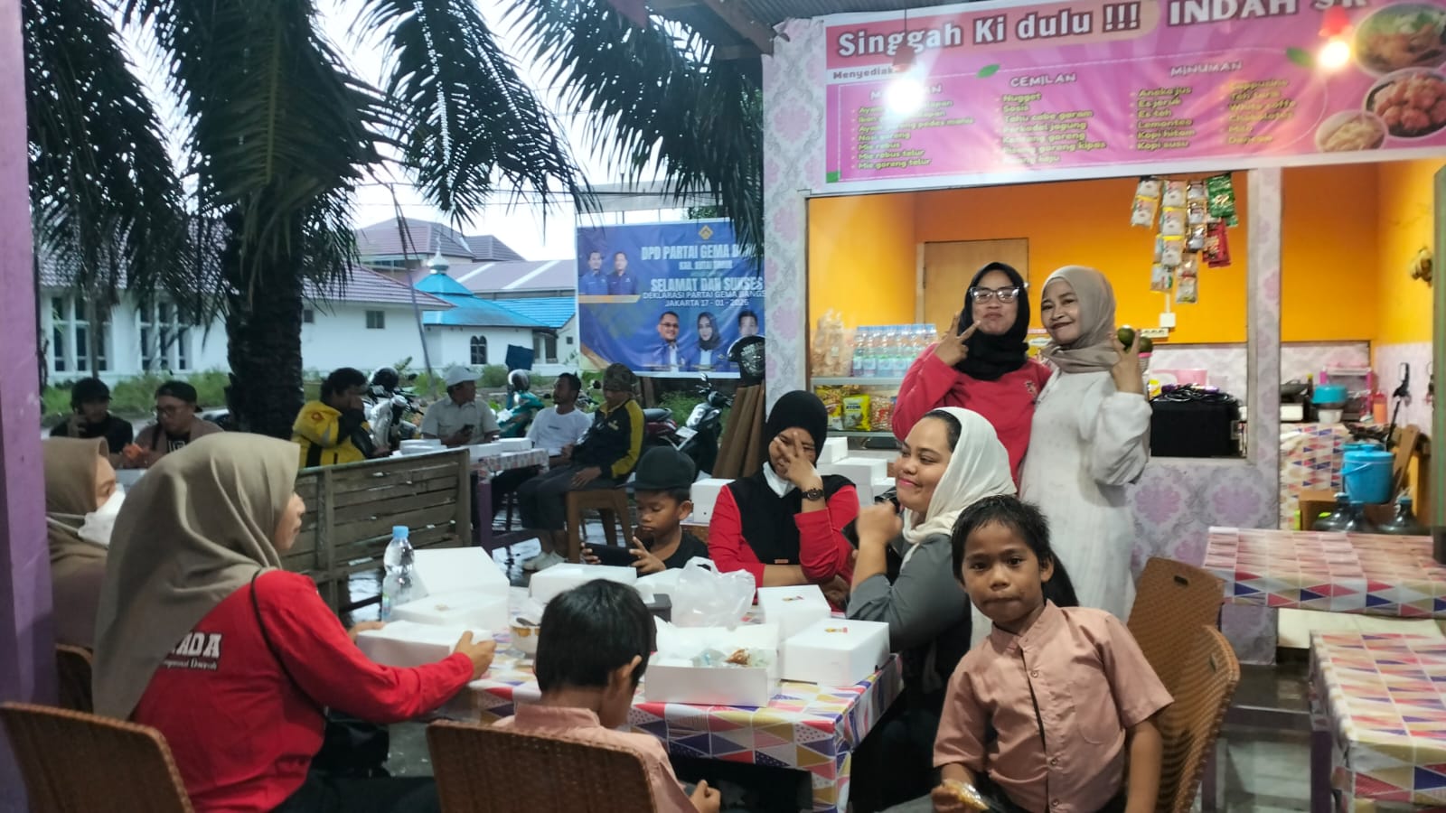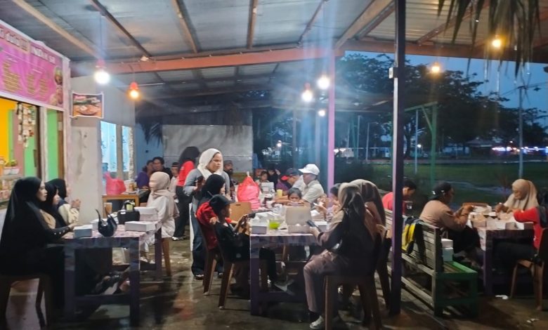 KEMBARA TIMUR, SANGATTA —- Lampu-lampu gantung mulai menyala ketika langit senja perlahan berubah gelap di kawasan Taman Bersemi, eks STQ, Desa Sangatta Utara, Kecamatan Sangatta Utara, Minggu (15/3/2026). Di bawah atap sederhana sebuah warung terbuka, puluhan orang tampak duduk berjejer di meja-meja panjang. Kotak-kotak makanan tersusun rapi, gelas minuman mulai dibagikan, dan percakapan hangat mengalir tanpa henti.